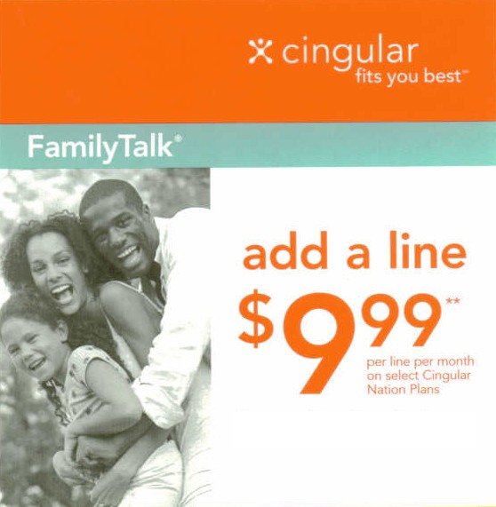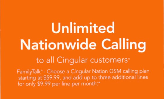 Add up to three FamilyTalk lines to a new or existing Cingular Nation plan for just $9.99 each per month. Additional lines are available on select Cingular Nation plans starting at $59.99 per month.
